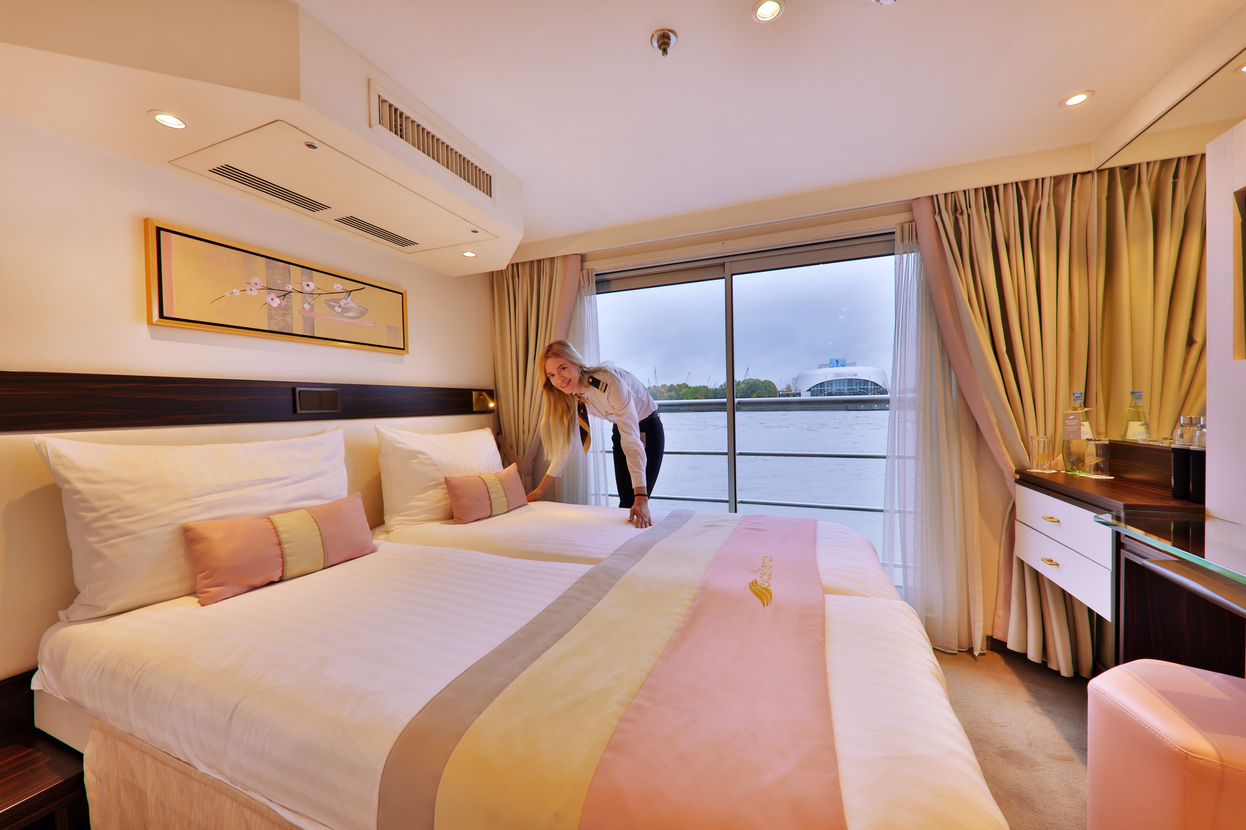 Die Excellence Pearl, ehemalige MS Rembrandt. Nach einer Havarie und einem Brand an Bord im Jahr 2015 mussten mehr als 120 Tonnen Material aus dem Schiff entfernt werden, bevor der eigentliche Umbau in der niederländischen Werft durch die Excellence-Reederei beginnen konnte. Zu den grössten Herausforderungen gehörte der Einbau von französischen Balkonen auf dem Oberdeck. Dafür musste die Stahlhülle aufgeschnitten werden. Wo vorher Oberfenster waren, entstand eine Glasfront mit freiem Blick auf den Fluss. 2025/26 erhielt die Excellence Pearl eine neue Motorisierung mit dem von Excellence entwickelten Abgasreinigungssystem Clean Air Technology.